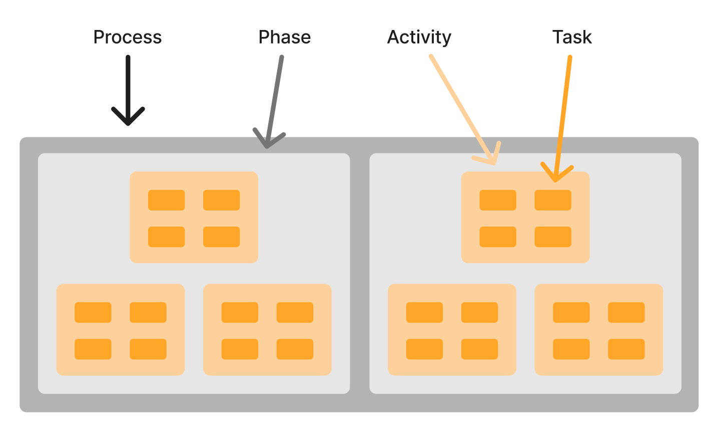 A process organizes the work on the product into distinct phases. In general, the work that is undertaken for a project will transition from one phase to the next. Each phase has specific activities and tasks that must be performed.